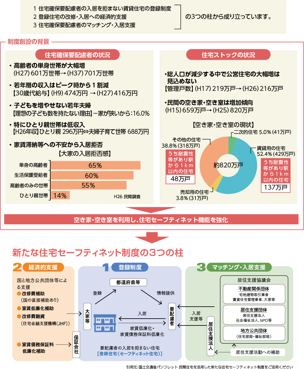 高齢者、障害者、子育て世帯等、住宅の確保に配慮が必要な方は今後も増加する見込みですが、一方で、民間の空き家・空き室は増加していることから、それらを活用して住宅確保要配慮者の入居を拒まない賃貸住宅の供給を促進することを目的として平成29年(2017年)に設立された制度※です。
