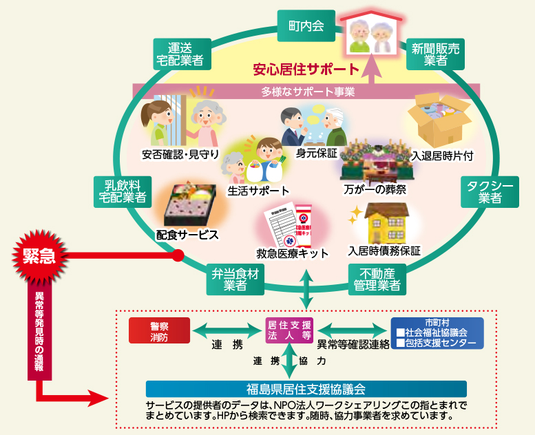 高齢者のほか、障がい者及び病弱単身世帯等の安定居住に係る支援を目的とした行政機関を始め地域ぐるみで構築するネットワークです。※1